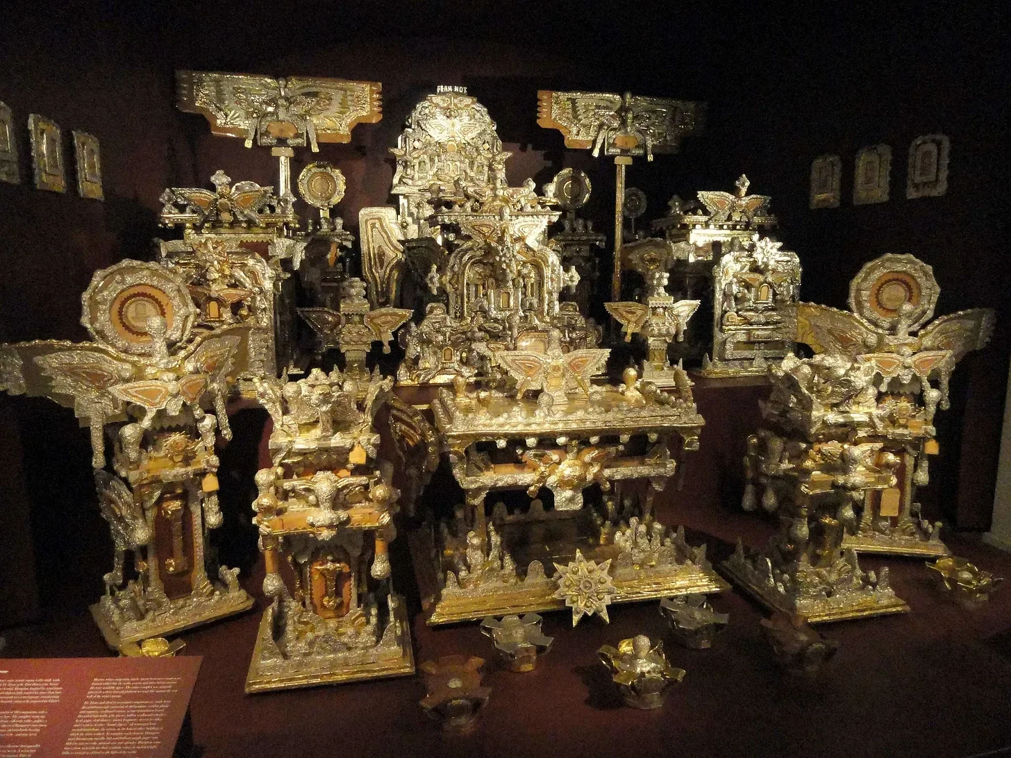 The Throne of the Third Heaven of the Nations’ Millennium General Assembly by James Hampton made 1950-1964. Hampton worked as a janitor and made this work in relative secret over the span of 14 years within a garage space off the apartment he was renting. He used scavenged materials such as aluminum and gold foil, old furniture, pieces of cardboard, light bulbs, jelly jars, shards of mirror and desk blotters held together with tacks, glue, pins and tape. The work was discovered after his death and now lives in the Smithsonian.